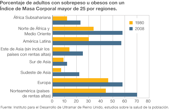 Las regiones de América Latina, África del Norte y Medio Oriente vieron un incremento en los niveles de obesidad hasta igualarse con Europa, donde el 58% de la población padece sobrepeso.
