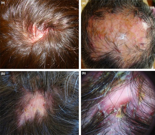 A nivel clínico, la presentación más común fue como una única placa de alopecia cicatricial localizada en vértex, con folículos en penacho.