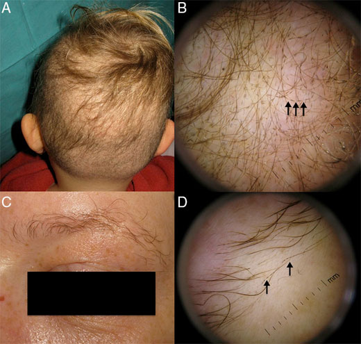 En la exploración física se observa una hipotricosis difusa con cabello corto, deslustrado y quebradizo, acompañado de áreas con eritema e hiperqueratosis folicular (figura A).